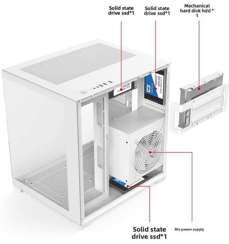 Compatibilité et organisation : Format micro-ATX avec alimentation positionnée en bas pour une meilleure gestion thermique et des câbles.